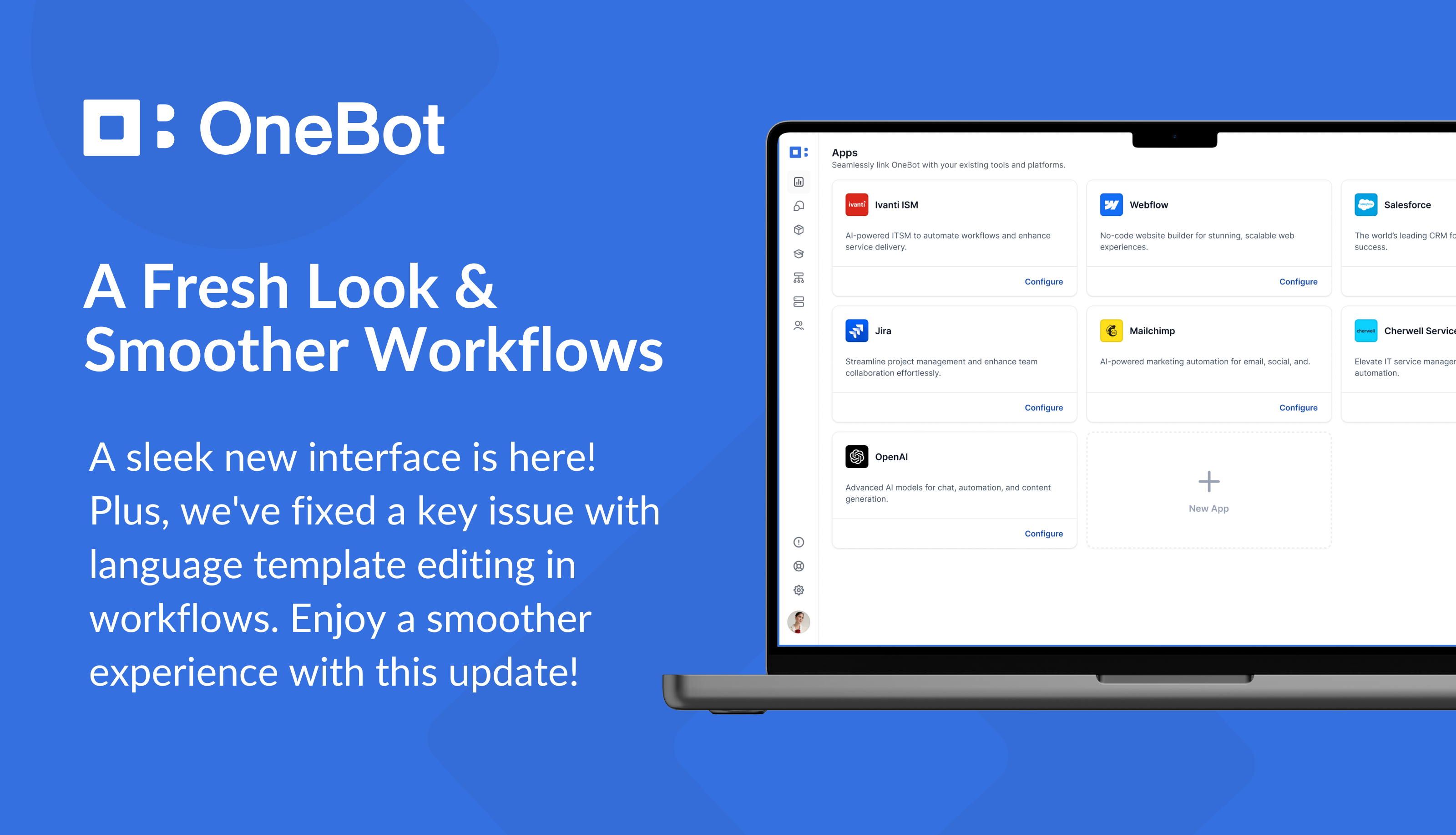 This update brings key fixes and a fresh navigation experience. We've resolved an issue that previously prevented language templates from being edited when modifying a card in workflows. Additionally, a brand-new interface navigation system has been introduced to improve usability.