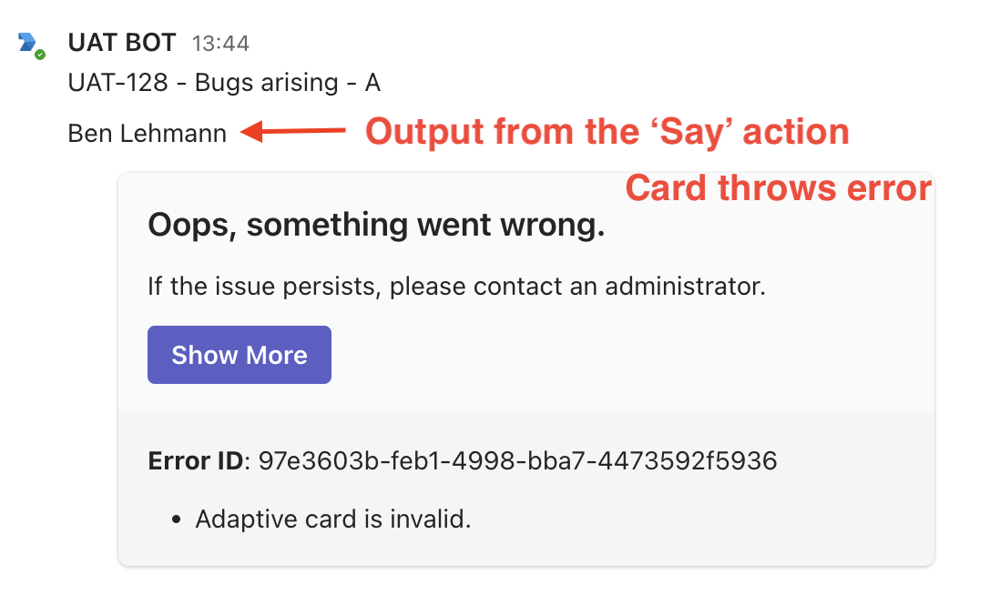 Run the workflow. You’ll see that the ‘Say’ action does display the text data correctly [i.e. ‘Ben Lehmann’ is printed into the chat stream], but that the card does not, and instead the card throws the ‘Adaptive card is invalid’ error.